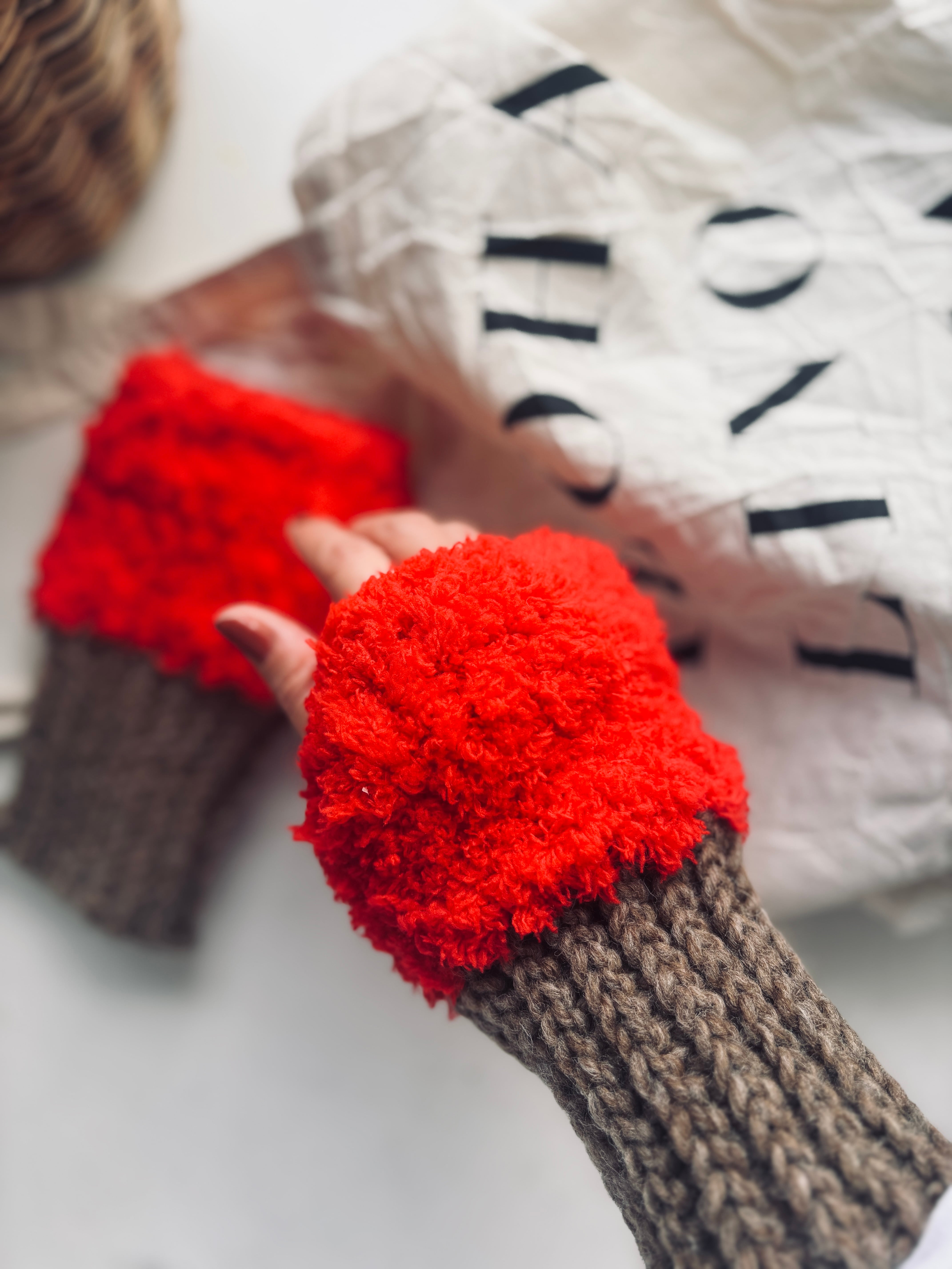 出来れば、手の甲部分は、もふもふ毛糸で編んでみて下さい。手首のリブとのイメージを変えると、このデザインを楽しめると思います♪